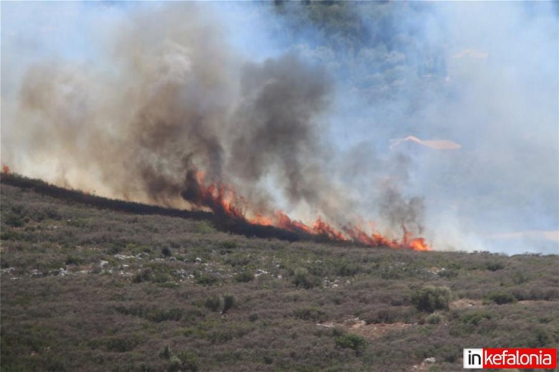 Σε πλήρη εξέλιξη βρίσκεται τα πύρινα μέτωπα γύρω από τα χωριά καπανδρίτι και αγία ειρήνη στην κεφαλονιά, με τις πυροσβεστικές.